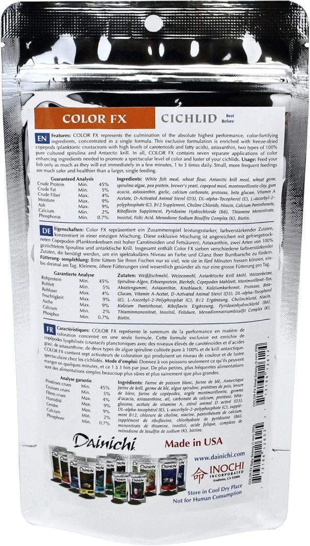 Flagship cichlid food from Dainichi. Ideal for a myriad of cichlids as well as other tropical fishes. Color FX has the highest variety of natural colour enhancing ingredients to date.