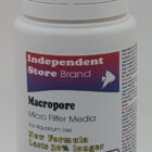Macropore is a macro-porous synthetic polymer that controls nitrates in freshwater and marine aquariums by filtering out nitrogenous waste products, resulting in crystal clear water. For freshwater aquariums, it can be recharged with a salt solution, while marine aquariums and occasional freshwater recharges require a bleach solution. The product is used in a mesh bag within the filter and needs to be replaced when it no longer clarifies water or bleaches white.
